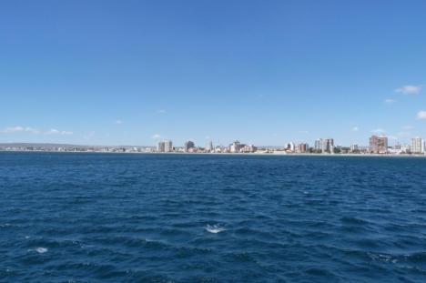 Perdemos quase 2 horas de viagem, mas passar o canal torna-se divertido com a aparição de um grupo de golfinhos que gostam de surfar nas ondas da balsa. São golfinhos completamente diferentes do que conhecemos no Brasil, o corpo deles é branco com barbatana, nariz e nadadeiras pretos.