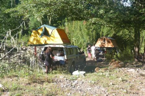 A região também é famosa por muitas termas e aproveitamos para conhecer a mais barata e rústica, é claro. Quando estacionamos o carro olhamos para o lado e havia outra caminhonete com barraca automotiva igual a nossa, e dessa vez do Brasil. Tinha diversas piscinas e muita gente, mas coincidentemente na piscina que escolhemos o Marcelo se deparou com dois brasileiros que haviam subido o Vilarrica com ele. Pai e filho, eram eles que estavam com a caminhonete com a barraca. Ficamos lá até o anoitecer conversando e decidimos todos juntos acampar em um local que eles indicaram, próximo a um rio.