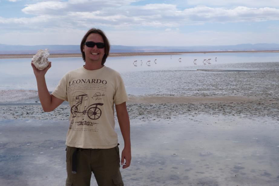 Depois fomos visitar o salar de Atacama, uma paisagem bem exótica. São blocos irregulares de cristais de sal secos com lama. No meio do salar tem dois lagos onde é possível apreciar flamingos em busca de micro organismos para se alimentarem.