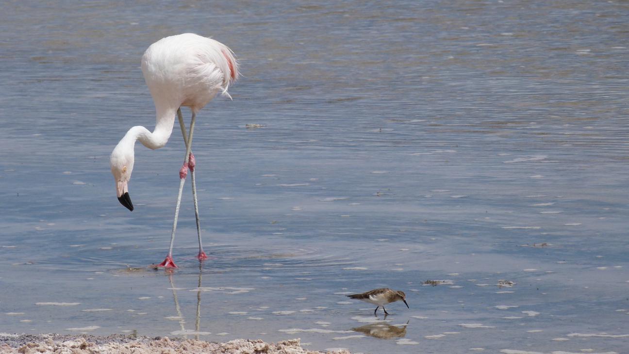 A caminho dos lagos fomos mascando folhas e tomando chá de coca. Impressiona como cada lago tem uma coloração completamente diferente. Apesar da altura não nos sentimos apunados. Apunado é o termo usado para as pessoas que sentem o efeito da altitude. A grande maioria tem muita dor de cabeça, enjôo, diarréia, gases, cansaço. Esta época do ano quase todas as lagunas desta região estão repletas de flamingos e não são todos iguais, tem três tipos com características bem diferentes. Encontra-se também muitas llhamas, vizcachas, vicunhas e gaivotas andinas.