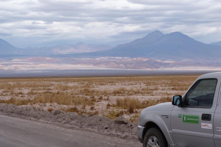 No caminho o céu estava ameaçando uma forte chuva, a estrada era de terra em meio ao deserto. Segundo os moradores as condições estavam razoáveis, mas claro que com a chuva pioraria muito. A chuva começou, mas claro que nós, que somos de clima tropical, estamos acostumados com fortes chuvas, então seguimos a viagem em meio à lama. A princípio tudo tranquilo. O sol voltou a aparecer e apreciamos a sua despedida em meio às montanhas e vulcões. Depois de um tempo começamos a sentir o estrago de um chuvinha no deserto. As estradas viraram pequenos lagos. O carro praticamente nadava na estrada, trabalhadores estavam nos trilhos de trem tirando lama e nós apenas no 4×4 para conseguir chegar até a fronteira.