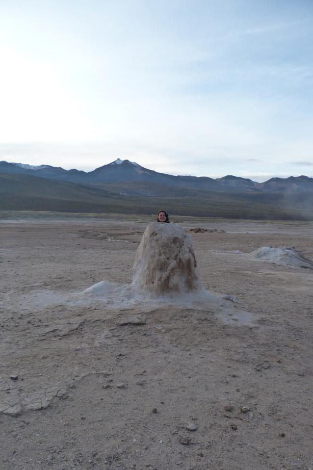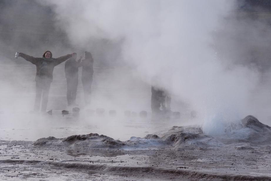 No dia seguinte nosso grupo mega animado acordou as 3:30h da manhã para ir aos gêisers, eles foram com um tour guiado e nós fomos seguindo eles de carro. Era noite, o caminho era iluminado pela lua cheia e ao longe dava pra ver as luzinhas vermelhas das diversas excursões que queriam chegar no melhor horário para apreciar os gêisers. Essa rota de, mais ou menos uma hora e meia, é famosa por ter diversos acidentes com brasileiros aventureiros que se perdem por essas serras de terra. Esses brasileiros, ai ai ai…