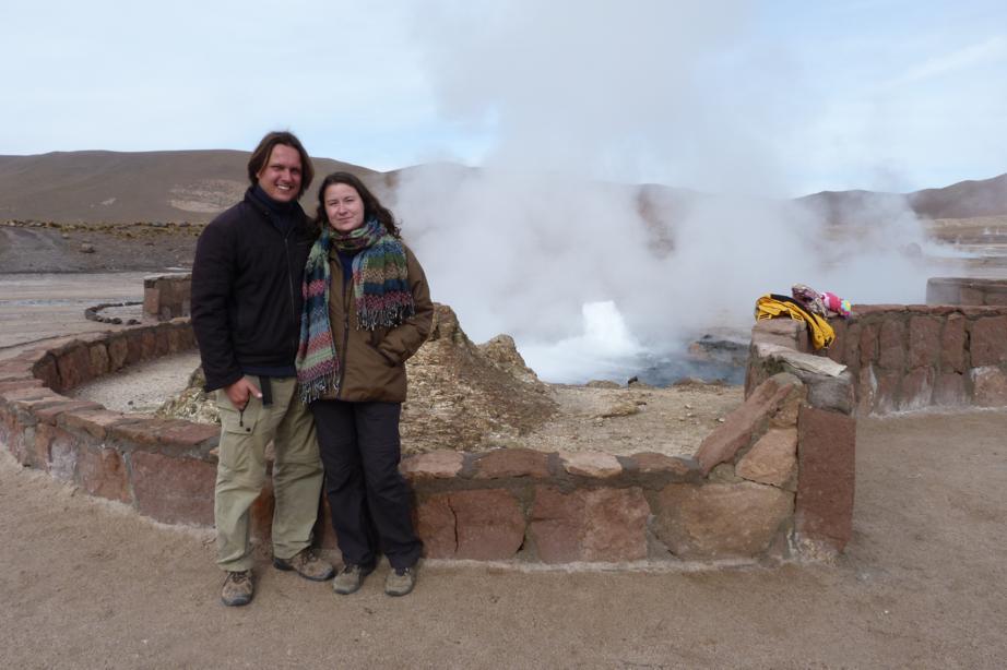 Quando chegamos fazia uns 4 graus negativos. Mas quem se importa, quando se vê nuvens de vapor e se ouve as borbulhas dos gêisers saindo da terra, você esquece o frio e se diverte andando pelo meio de mais ou menos 80 gêisers ativos. Alguns são muito engraçados, não parecem dar sinal de vida e de repente começa a cuspir água como se estivesse resfriado. Outros são com lama, outros formam uma piscina linda e transparente, mas cuidado, mesmo que você tenha uma grande vontade de se jogar, como alguns loucos já fizeram, não se arrisque, por que pode ser mortal.