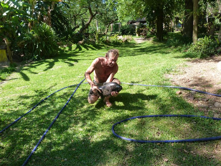 A reserva de Itabo fica a mais ou menos 45km dali se for pela estrada do interior. São diversos campos até a chegada. O Paraguai vive praticamente da agricultura, então o que não vai faltar são campos e mais campos para de apreciar. A terra é um barro quase que da cor bordô. Quando chegamos à reserva ficamos bobos com o local maravilhoso à beira da represa. Avistamos um gramado enorme muito bem cuidado e algumas casas de tijolo à vista, cada casa com sua função. Tem o escritório, restaurante, casa dos vigilantes, entre outras. Tem também quadras de futebol, vôlei, mesa de sinuca e o melhor de tudo, uma casa enorme com varias suítes grandes onde podíamos escolher a que quiséssemos. Todos os quartos tinham ar condicionado. Uma sala grande com lareira, uma cozinha coletiva enorme e só nós ali para desfrutar daquele paraíso.