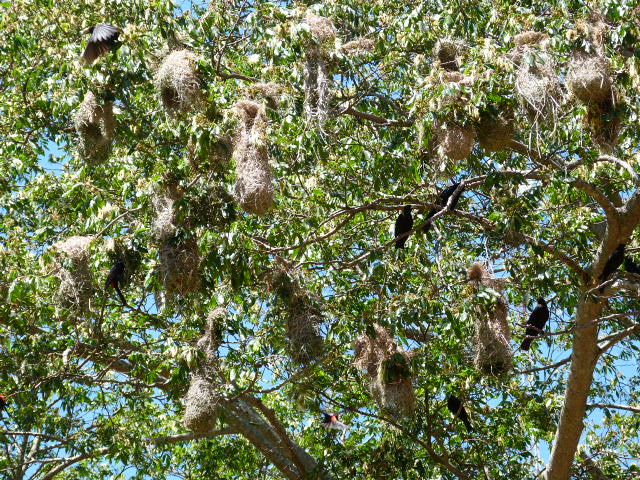 Não conseguimos achar muitos animais na trilha para tirar fotos, mas tem um pássaro na região que demorei para conseguir pegar nas fotos, era sempre muito tímido. Eis que descobri que do lado da casa onde estávamos tinha uma grande árvore com vários ninhos desse pássaro. O canto dele era muito cômico, tinha horas que ele parecia estar rindo.