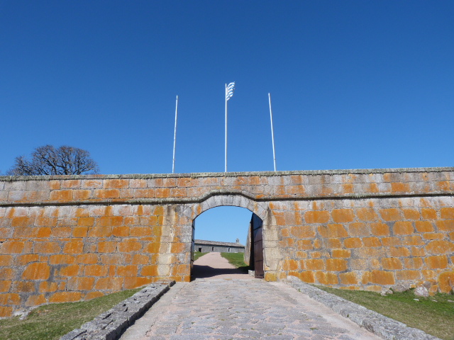 A Fortaleza de Santa Teresa é linda, toda de pedra. Eu e o Julio ficamos um tempão discutindo se ela era pintada de laranja ou se era um limo (ou sei lá o que) que deixou a pedra alaranjada com o tempo. Eu ganhei, era um sei lá o que alaranjado, e deu um charme todo especial para a fortaleza.  Não falta canhões, armas e artigos de guerra,  sanitários. Faltou apenas a guerra. A fortaleza nunca chegou a ser utilizada, e não é pequena a construção. Fora de temporada a visitação é aberta apenas de quinta a domingo. Na saída, todos os visitantes que encontramos eram de Santa Catarina e ninguém estava junto, foi pura coincidência.