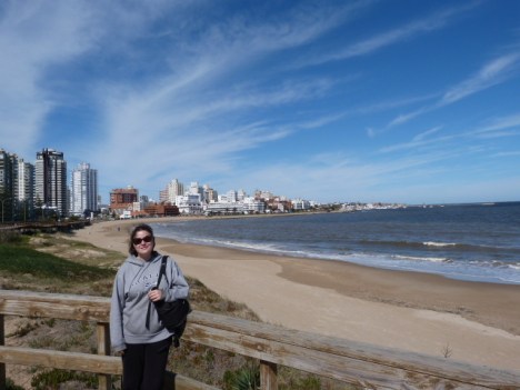 A praia de punta tem calçadas para caminhada, marina para lanchas (e muitos iates) e mar de um lado e rio do outro. A melhor definição que vi sobre o mar foi no blog  http://www.idasevindas.com.br : “Mar cor de doce de leite”. Claro que não deve ser sempre assim, mas durante o período que estivemos lá essa era a cor. Como praia, Punta del Este é uma bela cidade.
