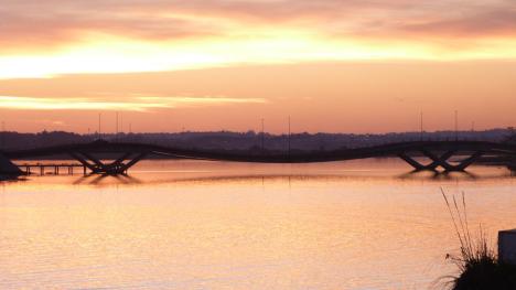 Por do sol na ponte ondulada da barra