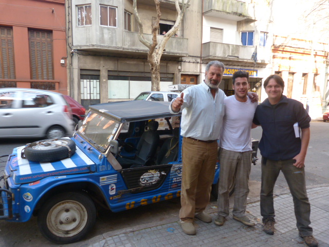 Quando estávamos em Atlantida, Rosario, uma uruguaia pra lá de simpática, nos comentou sobre uma família de uruguaios que viajaram o mundo todo por 4 anos em um Citron Mehari. Eles retornaram há pouco tempo para Montevidéu. Ela encaminhou um e-mail para eles para saber se eles poderiam nos conhecer. Assim poderíamos compartilhar um pouco de nossas historias e pegar algumas dicas. Mario, o pai, e Matias, um dos filhos, nos receberam muito bem, tivemos uma agradável conversa e pegamos dicas muito interessantes. Além disso, tivemos a oportunidade de comprar o livro com toda a história e roteiro que nos ajudaram muito. O objetivo de sua viajem era conhecer uruguaios que estavam morando em outros países e convencê-los a voltar ao Uruguai. Aproximadamente um terço da população do Uruguai vive for a do país. O carro deles é bem pequeno e muito simpático. Foi um prazer termos tido o contato com esses aventureiros. Quem tiver interesse em conhecer um pouquinho mais acesse: http://www.uruguayporelmundo.com/